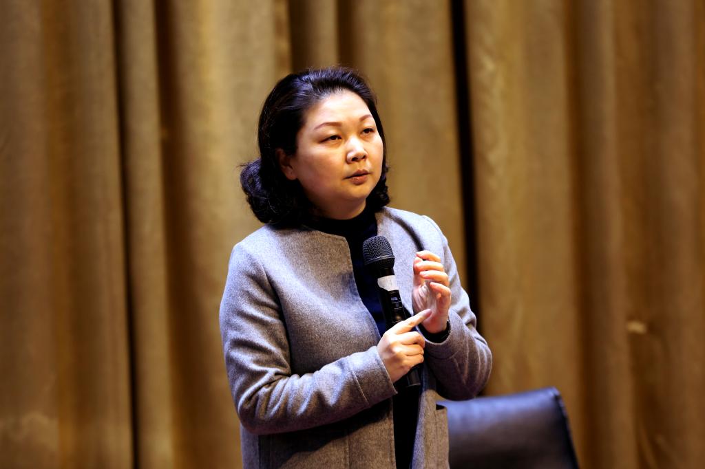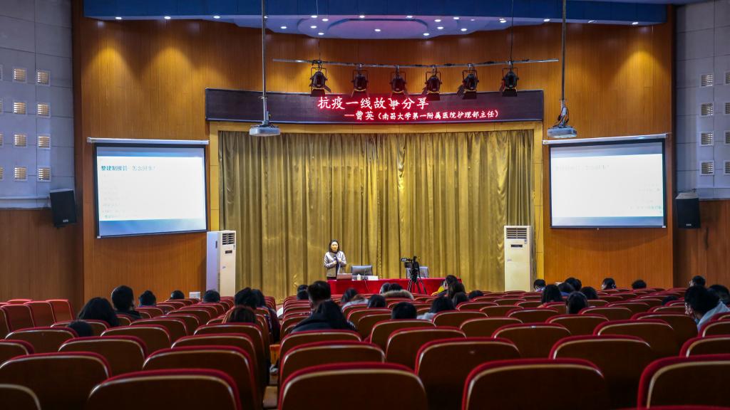 本网讯(记者团记者/李欣铮 摄影/黄愈)1月15日下午,学校邀请南昌大学第一附属医院护理部主任曹英在浴星湖大讲堂分享了她的一线抗疫故事。因学校疫情防控工作要求,现场40余位教师代表隔位而坐聆听了此次讲座,现场采用全程录制的方式,供师生结束后在线观看。讲座由马克思主义学院院长于冰雁主持。