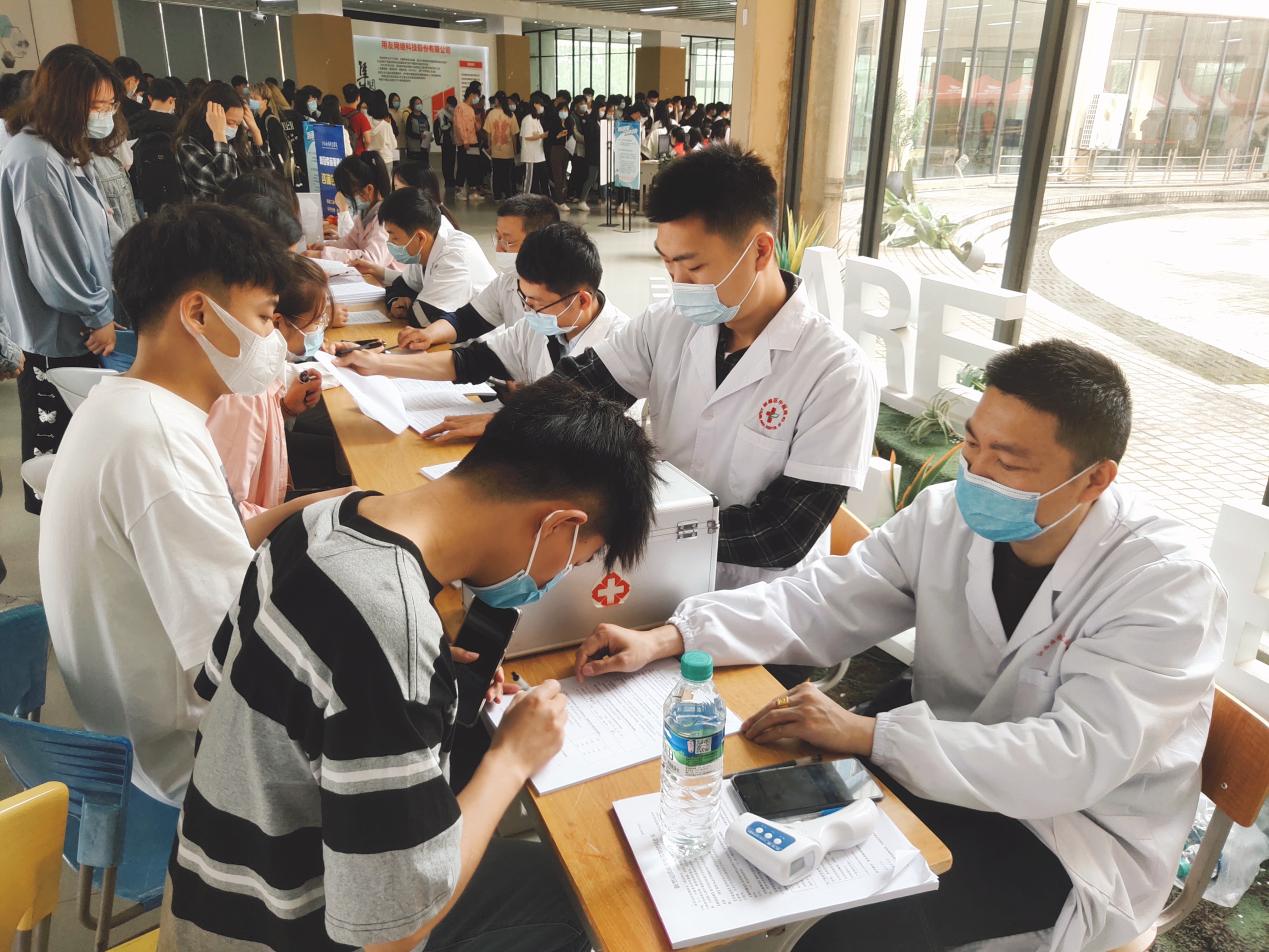 疫苗接种现场设置了等候区、预检分诊区、登记区、接种区、留观区等。接种现场井然有序,流程高效快捷。疫苗接种前,学生先在等候区内有序排队,各分院教师在现场协调安排。学生分组分批进入场内的预检分诊区领取并阅读《新型冠状病毒疫苗知情同意书》,随后在医生的指导下填写《新型冠状病毒疫苗个人信息登记表》,在确认符合接种标准、填写完登记表后,学生们凭借身份证到登记区录入个人信息。以上步骤全部完成后,方可在接种区进行接种。接种完毕后,由志愿者引导进入留观区,观察满30分钟确认没有不良反应后即可签字离场。整个环节为“不走回头路”的单向通道。