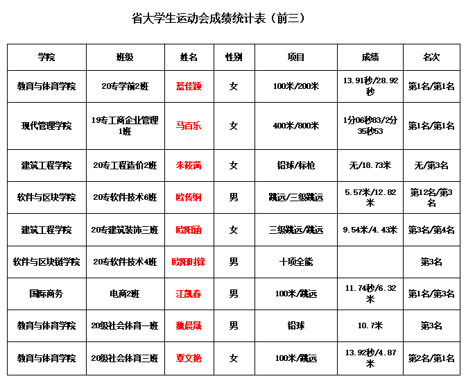 学校体育教学部在三月中旬组建校田径队,田径队运动员由来自各个学院的30位学生运动员组成。在领队王文平,教练张荆、沈友华和刘志政的带领下参加了专科甲组、专科乙组和本科乙组的竞赛项目。