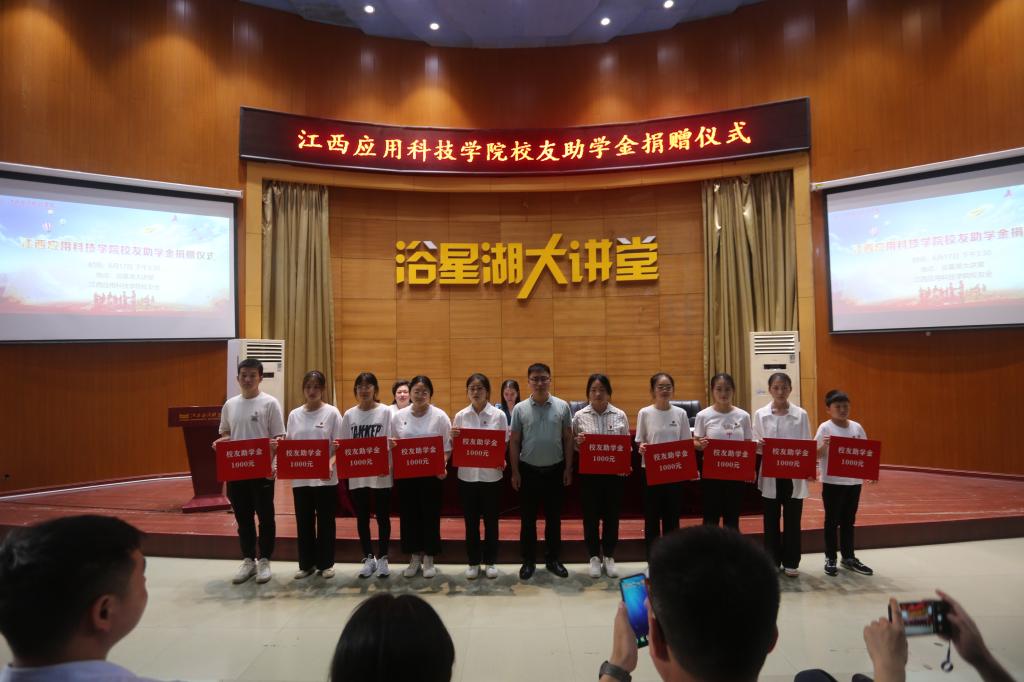 本次捐赠仪式在全体成员悠扬的校歌声中圆满结束。仪式结束后,学校领导、校友丁林坡与校友助学金获得者合影留念。