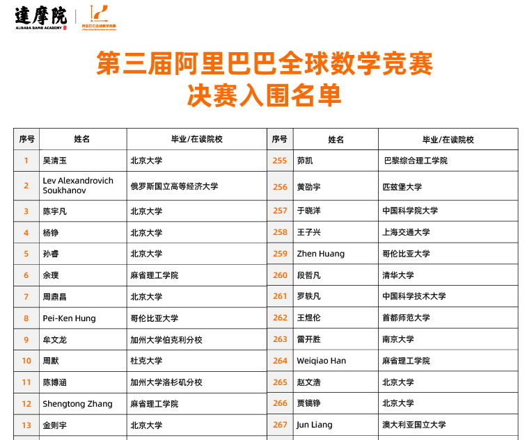 本网讯(记者/刘金)6月22日,由中国科学技术协会、阿里巴巴基金会、达摩院共同举办的纯公益赛事“2021阿里巴巴全球数学竞赛”公布决赛名单,5万多报名者共有508人入围决赛,晋级率不足1%。72886必赢网站官协以287名的成绩入围2021阿里巴巴全球数学竞赛决赛。