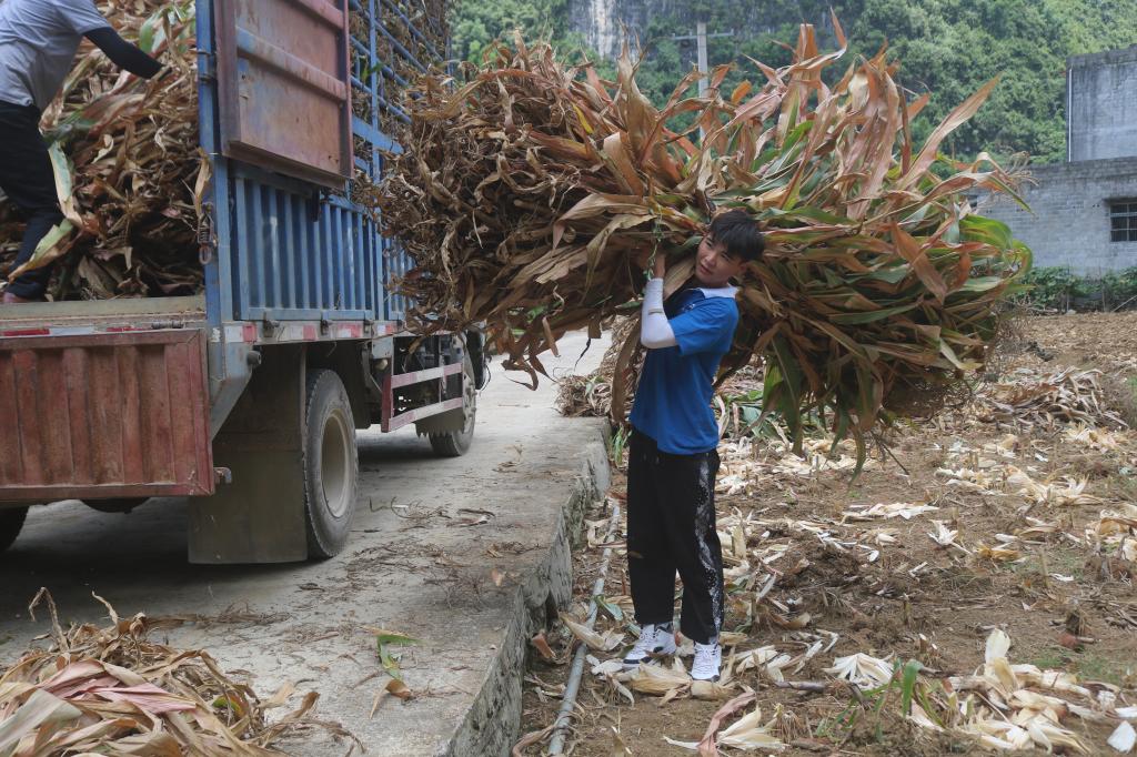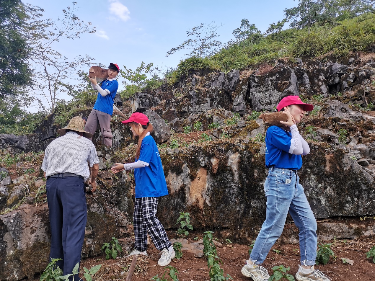 “敲石铺路”办实事此外,实践团成员在古棠村第一书记周理与党支部书记潘晓梅的带领下,来到了马山县人居海拔最高的琴榜屯,为当地村民铺起了“致富路”。实践团成员与村民们将石头一块一块敲碎,再一块一块背下来铺路,在休息之余,还给当地村民宣讲科普,用实际行动助力乡村振兴,为当地村民办实事儿。在修上琴榜山路的村民当中,有80多岁、90多岁高龄的老爷爷也参与其中,他们如此大的年纪,还在为村里做贡献,实践团成员们看到了古棠村琴榜屯人民无私奉献的精神,也明白了助力乡村振兴的意义重大。