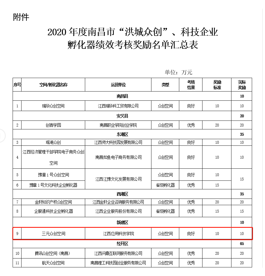 据了解,2020年度南昌市“洪城众创”、科技企业解化器绩效考核工作分别评出“洪城众创”5家优秀单位,15家良好单位,5家优秀省级科技企业孵化器。其中,“洪城众创”年度绩效评估为优秀、良好的运营单位一次性分别给予20万元、10万元的奖励,对孵化器年度绩效评估结果为优秀的省级孵化器、市级孵化器运营单位分别一次性给予15万、10万的奖励。