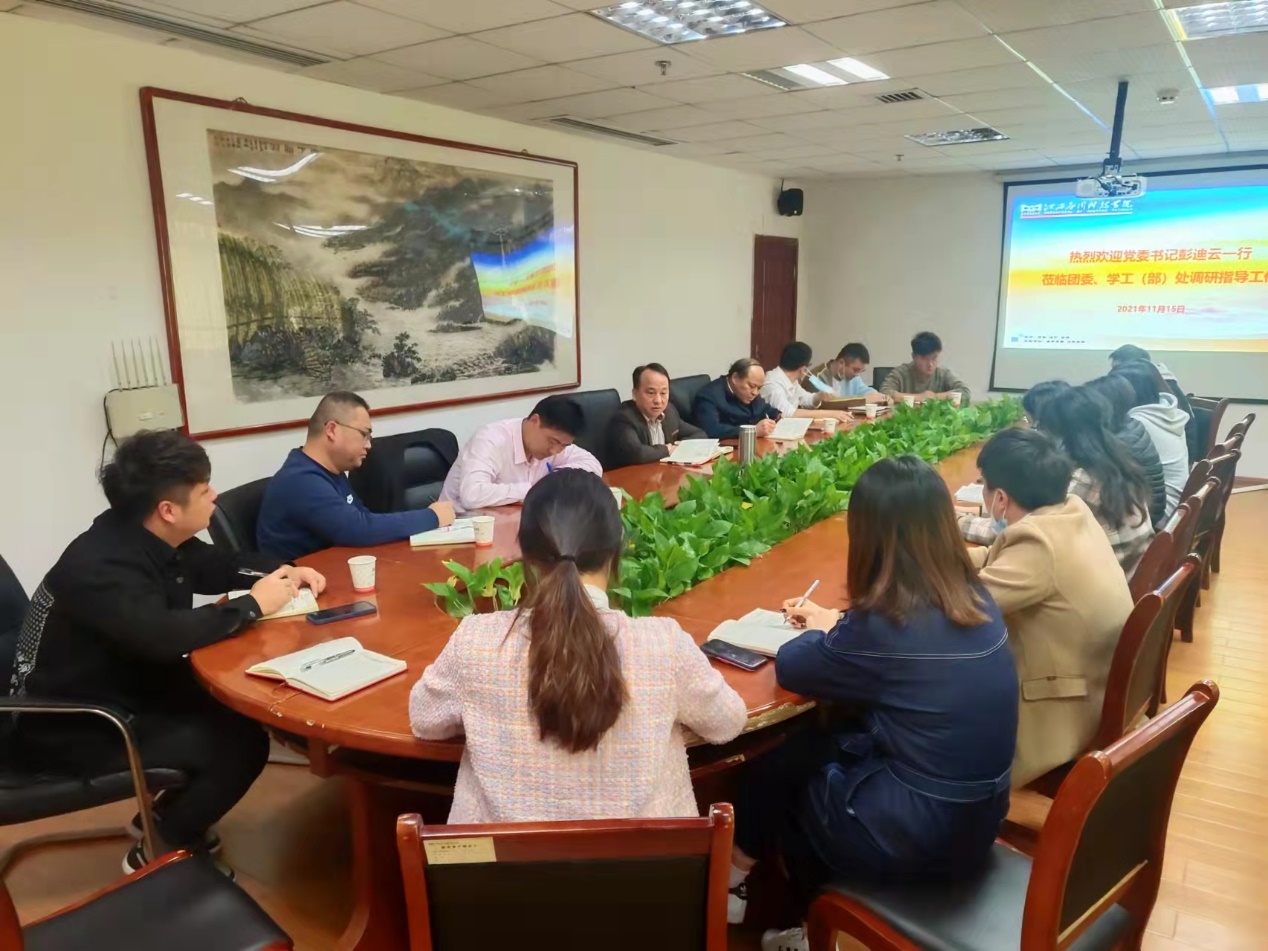 本网讯:11月15日上午,党委书记彭迪云,党委副书记席芳宽一行到团委、学工(部)处调研指导工作并在综合大楼六楼会议室召开座谈会。党委综合办主任江星陪同调研。团委、学工(部)处全体人员参加座谈。