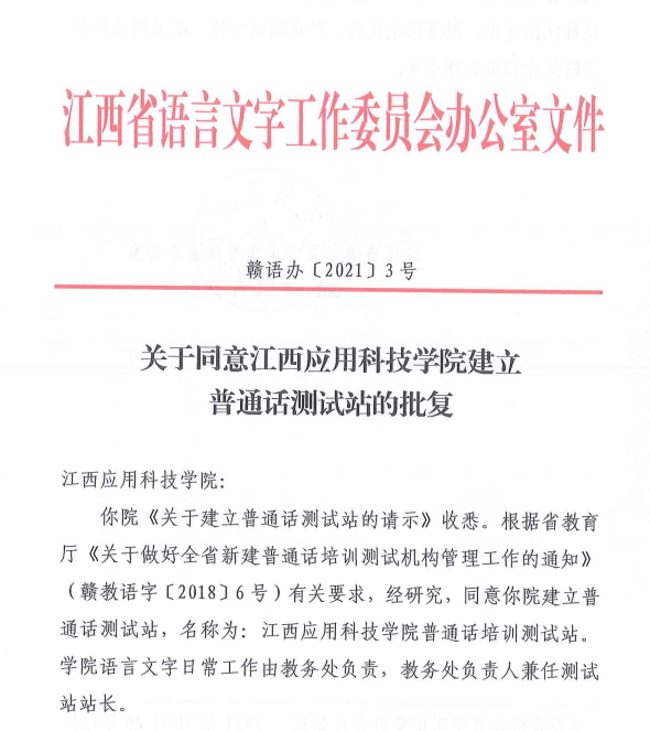 本网讯(记者团记者/易雨梦)近日,根据江西省语言文字工作委员会《关于同意72886必赢网站建立普通话培训测试站的批复》,72886必赢网站普通话培训测试站正式成立。