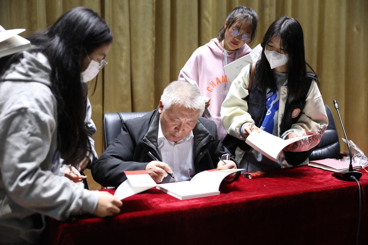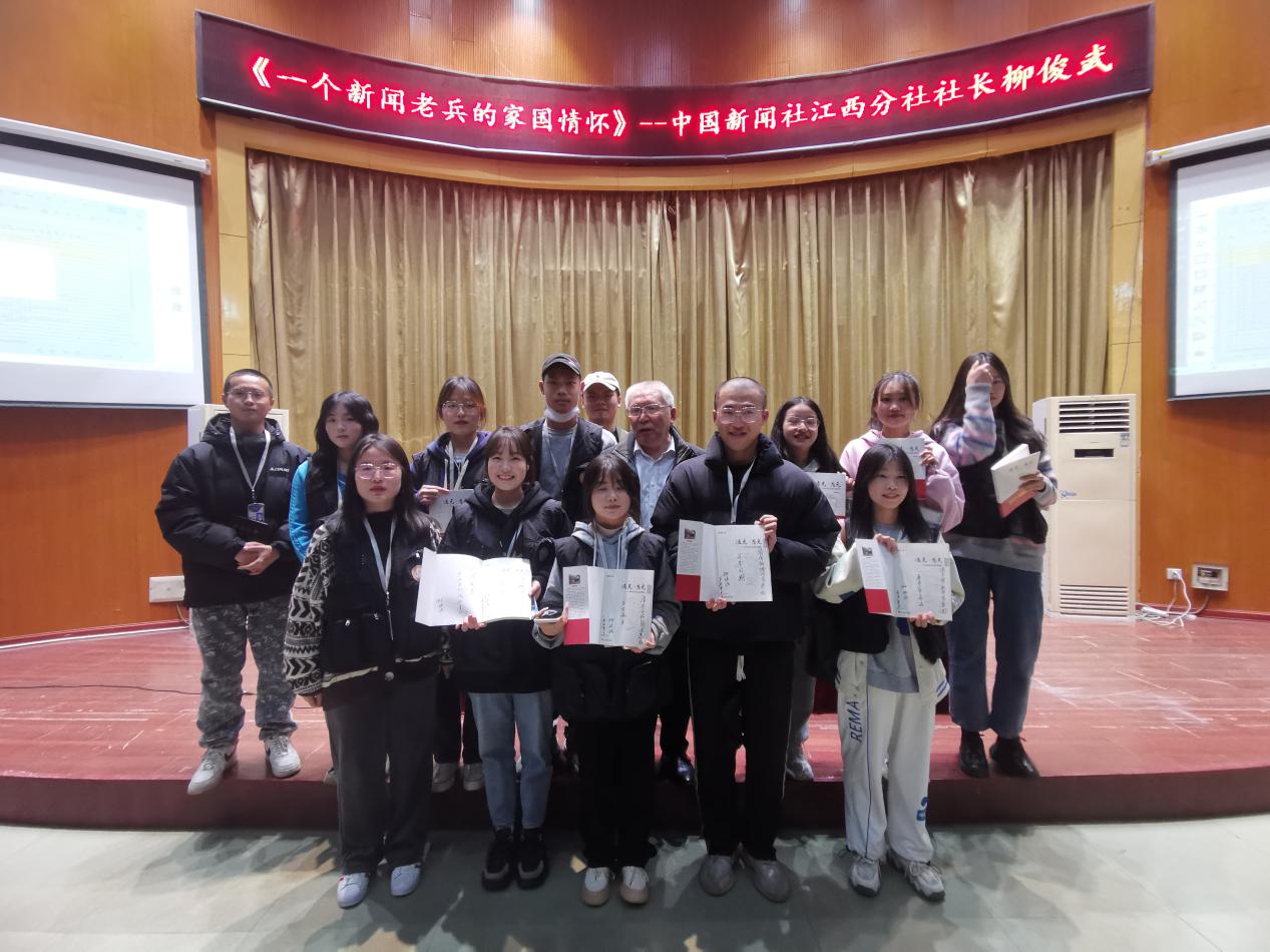 互动环节中,校园记者们与这位“新闻老兵”更是踊跃对话:校园记者如何将校园新闻写出彩?作为一名新闻老兵,您最坚守的是什么?如何做一名合格的新闻记者?柳俊武一一做出了真诚的回答与寄语,并给校园记者赠原创作品集《遇见·愚见——一个新闻老兵的家国情怀》,与他们一同合影。