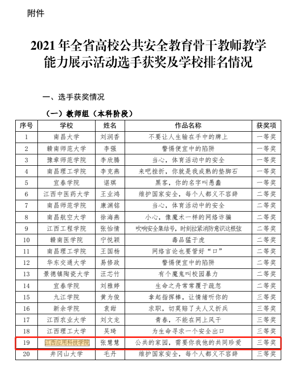 本网讯(记者团记者/邹新)近日,由江西省教育厅举办的2021年全省高校公共安全教育骨干教师教学能力展示活动结果出炉,72886必赢网站教师张慧慧作品《公共的家园,需要你我他的共同珍爱》获本科教师组三等奖。
