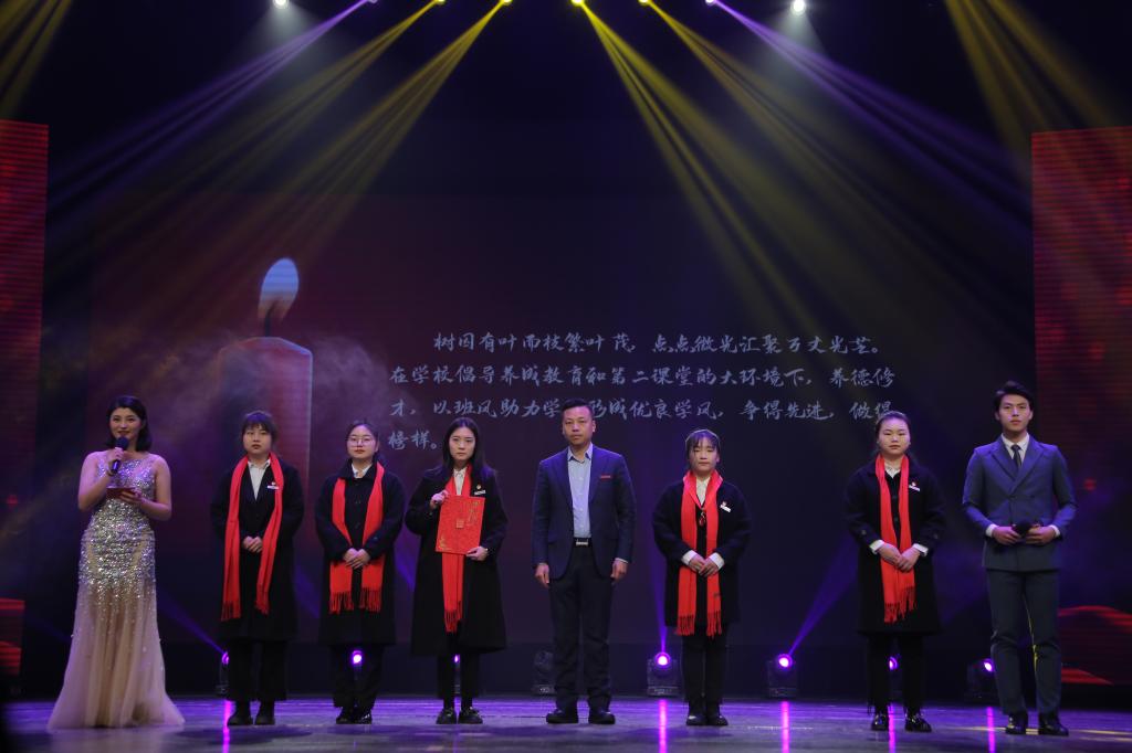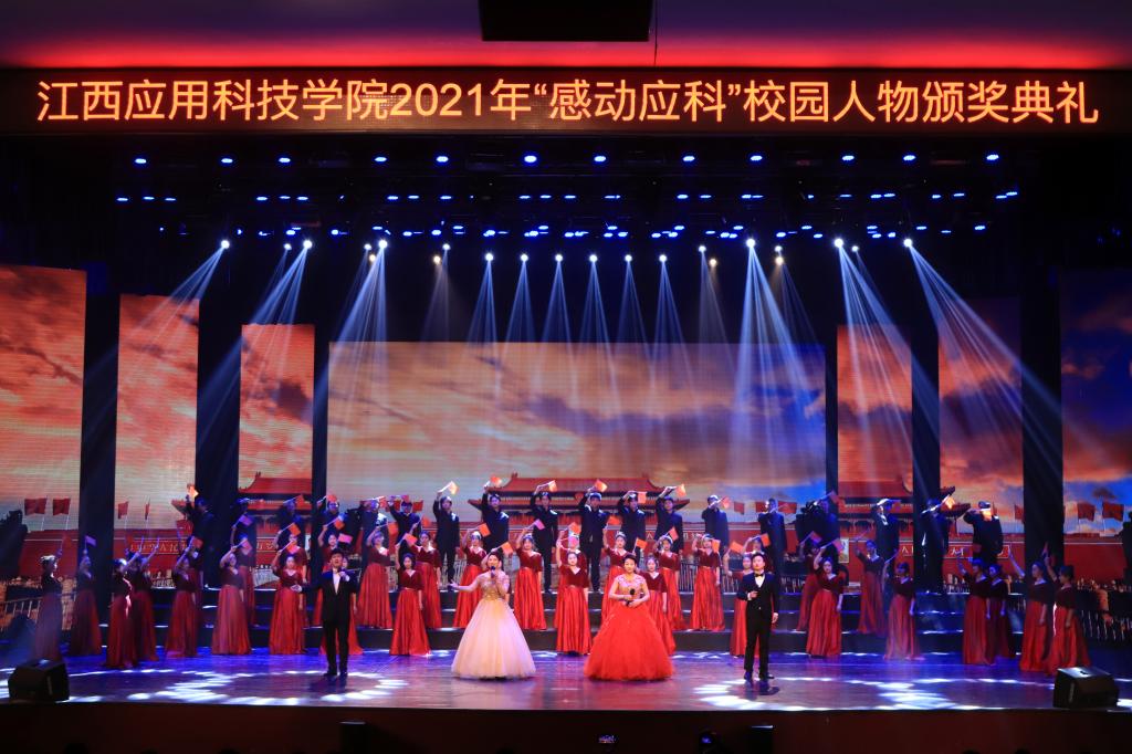 颁奖典礼上,学校精心准备的各个节目异彩纷呈。辰林国乐团演奏的《春节序曲》《扬州小调》《敖包相会》等民乐歌曲以清新优美的曲调,欢快喜庆的音律传递出温暖与希望。大合唱《唱支山歌给党听》,讴歌党的丰功伟绩,抒发爱党爱国情怀。《最美的太阳》《江格尔》《家在远方》《绽放吧青春》等歌舞生动的展现了应科学子的青春与活力,道出了应科奋发向上的精神理念。情景朗诵《穿越时空的对话》铿锵有力,深情歌颂了先烈们坚贞不屈的英雄气概,演绎着无愧时代的青春之歌。歌曲《领航》高亢激昂,唱响了气势磅礴、催人奋进的时代颂歌,深深地激荡着各位观众的心灵。