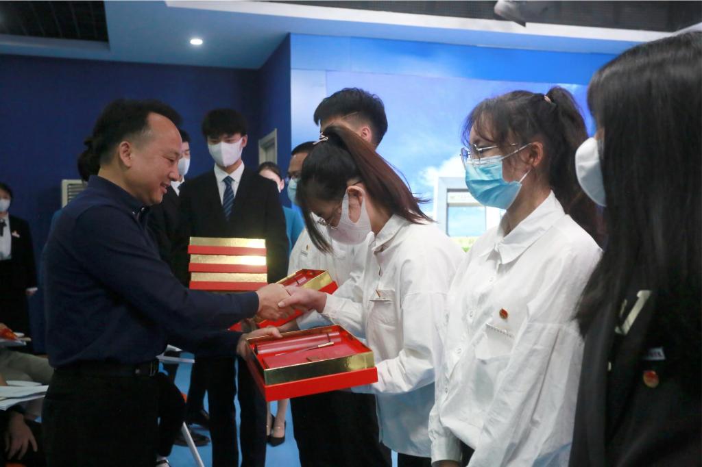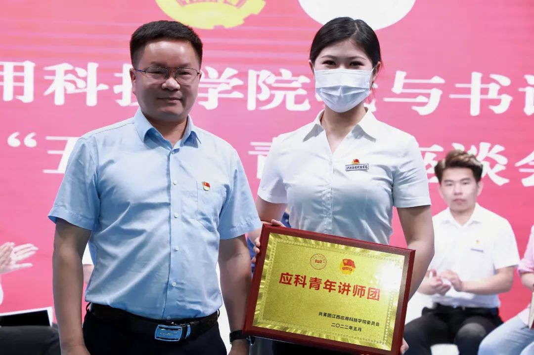 座谈会上,党委书记彭迪云为学生代表赠送五四青年节礼物;副校长刘春斌为应科青年宣讲团成员授牌。
