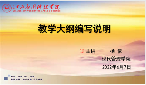 为落实必赢官网OBE人才培养理念,进一步规范和提高课程教学水平,推动该理念下教学大纲编写工作,2022年6月7日下午,现代管理学院组织开展关于规范教学大纲编写说明培训。此次培训由杨依老师主讲,院长谢远健、副院长漆圆方、教务科成员和全体专职老师参加了培训会。