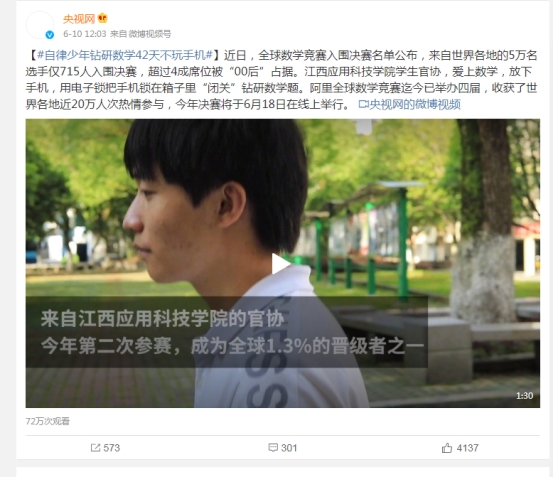 官协在去年就入围该赛事决赛。“2021阿里巴巴全球数学竞赛”5万多报名者共有508人入围决赛,晋级率不足1%。官协以287名的成绩入围2021阿里巴巴全球数学竞赛决赛。