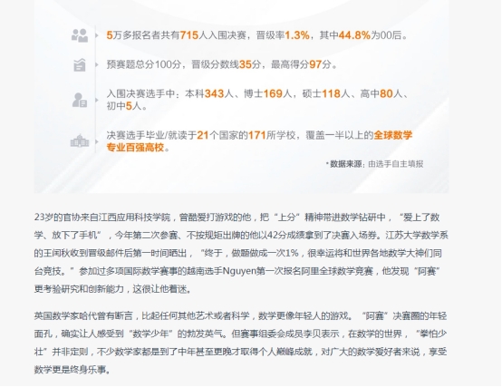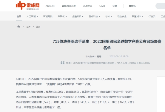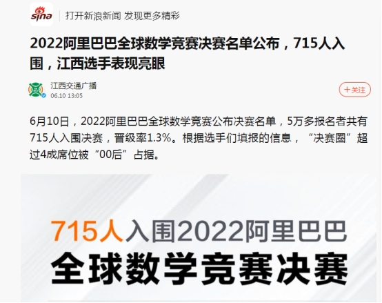 6月10日,2022阿里巴巴全球数学竞赛公布决赛名单,5万多报名者共有715人入围决赛,晋级率1.3%。本届赛事于4月举行预赛,预赛总分100分,晋级线35分,最高得分97分,由麻省理工学院一位“00后”选手创造。