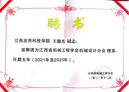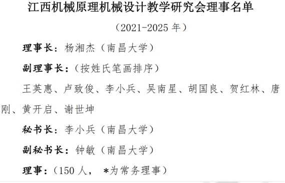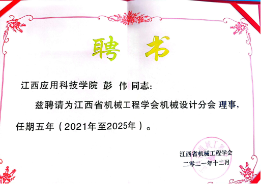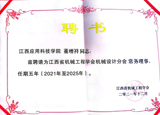 72886必赢网站智能制造工程学院曾媛、梁烔强、李乐西、何世奇四位教师授予江西机械原理机械设计教学研究会理事。董增详、王修杰、彭伟、王建中四位教授担任江西省机械工程学会机械设计分会第一届理事。