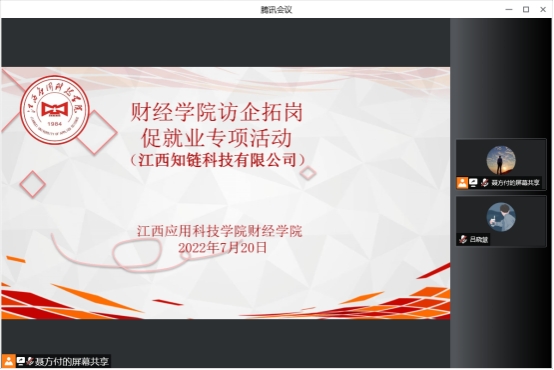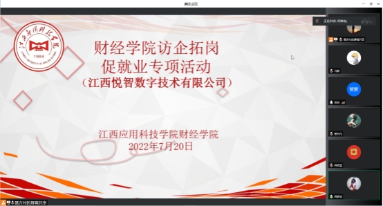 为持续贯彻落实党中央、国务院“稳就业”“保就业”决策部署,促进我院毕业生高质量就业,巩固拓宽毕业生就业渠道。2022年7月20日下午三点,财经学院于综合大楼207举行线上“访企拓岗促就业专项活动”。财经学院党总支书记何难绝、财经学院学工科科长赵贺贺及2022届毕业班辅导员参与活动,本次线上访企活动邀请到了江西知链科技有限公司、江西悦智数字技术有限公司、北京大玩家娱乐股份有限公司优秀企业代表参会。