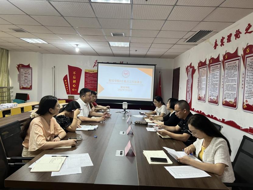 2022年7月29日上午,财经学院召开8月重点工作部署会,副校长胥懋云莅临出席会议,财经学院院长揭志锋、党总支书记何难绝、副院长匡文婷、全体党政班子成员参加会议,会议由财经学院院长揭志锋主持。