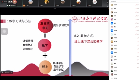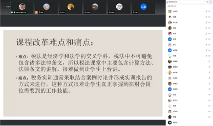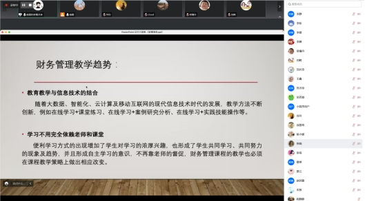 刘仙风和杨磊组成教学团队对财务管理课程进行说课,深入分析了财务管理课程的教学趋势,将重点在在线学习+课堂练习、在线学习+案例研究分析、在线学习+实践技能操作等方面深入挖掘。