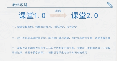江雯老师提出了使用任务驱动式授课模式:教师讲授框架并布置任务、学生分组完成任务、学生上台展示、全班交流总结,四步走的教学思路,打破了传统课堂填鸭式的困境,加深学生理解课程,引导学生主动学习课程中的知识点。