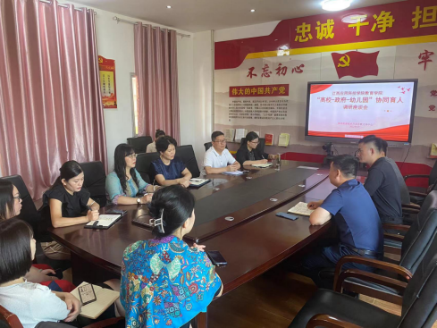为推动学院专业建设和教学改革的全面发展,进一步完善学前教育专业人才培养体系,8月25日,学院院长郑昌保、教务科副科长袁野、学工科副科长张伟建等一行四人赴南昌经开区教文体事业发展中心就“校-政-园”协同育人调研,并与南昌经开区教文体事业发展中心副主任熊筱英,学前科科长应宗保、教研室主任曹枫,经开区一幼、二幼、锦城幼儿园园长开展座谈。