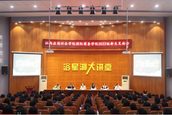 2022年9月8日上午,国际商务学院在浴星湖大讲堂隆重举行2022级新生见面会。校党委委员、副校长胥懋云,国际商务学院院长王慧,党总支书记徐青,教务科科长黄小艳,学工科科长唐燕琴,22级新生辅导员老师,22级全体新生参加了本次大会,本次会议由办公室主任钟露主持。