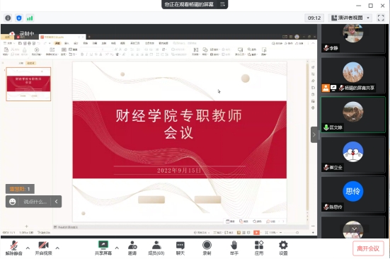 9月15日下午,财经学院在线上召开了专职教师例会,财经学院院长揭志锋、副院长匡文婷、教务科科长李静、各教研室主任及全体专职教师参与会议,会议由匡文婷主持。
