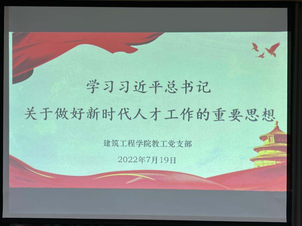 7月19日下午,建筑工程学院教工党支部在学院302党员活动会议室开展理论学习进行时:教工党支部系列主题学习。本次主题学习内容是学习《习近平总书记关于做好新时代人才工作的重要思想》精神。主题学习活动由建筑工程学院教工党支部书记许冬冬主持并带领学习,教工党支部全体党员与会学习。