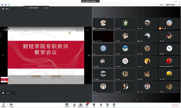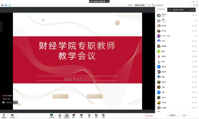 9月23日晚上,财经学院在线上召开了专职教师例会,财经学院院长揭志锋、副院长匡文婷、教务科科长李静、各教研室主任及全体专职教师参与会议,会议由李静主持。