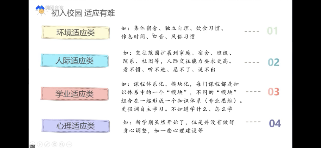 接下来曾老师就大学新生角色身份、生活环境、学习方面、评价标准和人际关系方面法变化,提出大学新生应该要完成生活环境、人际关系和学习上的适应。之后,曾老师又提出大学新生常见的适应心理问题:迷茫、失落、抑郁等等,并强调了关注心理健康的重要性。