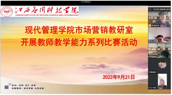 为进一步提升教师教学能力,促进教师专业成长,9月21日下午16:00,现代管理学院市场营销教研室开展教师教学能力系列比赛,此次比赛由教研室主任温玲英主持。