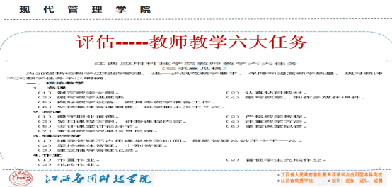 会上,谢远健院长强调为加强我院教学过程的管理,规范教学要求,提高教学质量,加快本科教学工作合格评估,现一起学习学校教学文件,明确教师的六大教学任务,具体如下: