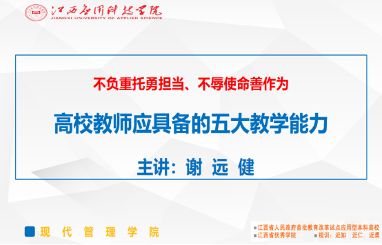 为进一步推动教师专业发展,提升教师教育教学质量,从而提高人才培养质量,2022年10月19日,现代管理学院在综合楼1001室开展了教师教学综合能力提升专项培训活动。本次培训会由学院院长谢远健主讲,学院全体教师参加了培训会。