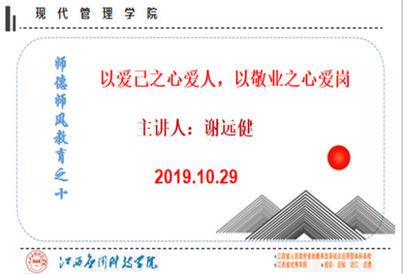 2019年10月29日下午,现代管理学院在综合大楼908党员活动室开展师德师风系列主题教育活动,本次教育活动的主题为以爱己之心爱人,以敬业之心爱岗。分院全体教职工参加了此次的学习活动,主讲人为分院院长谢远健。