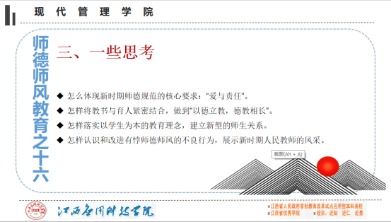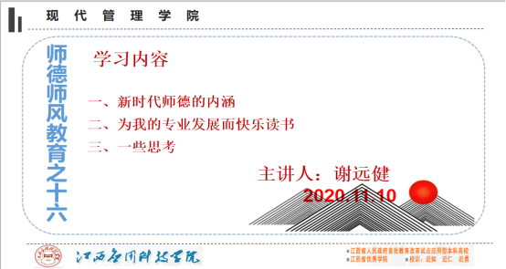 2020年11月10日下午3:20,现代管理学院在综合大楼1001党员活动室开展师德师风系列主题教育活动,本次教育活动的主题为新时代师德的内涵及相关思考。分院全体教师参加了此次的师德师风教育学习活动,主讲人为分院院长谢远健。