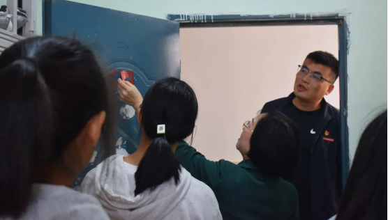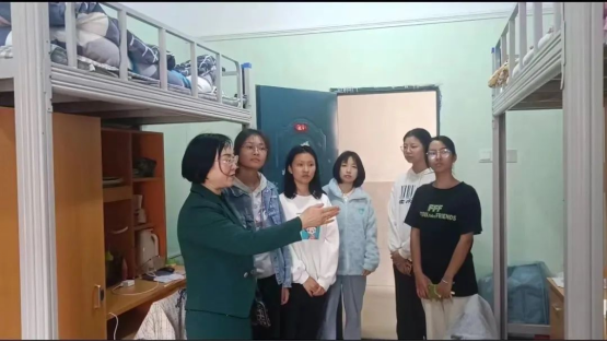 午饭过后,胥校长深入学生宿舍,看见本班级同学们把宿舍收拾地井井有条,胥校长对此感到非常满意。与此同时,胥校长看到门上的污渍,强调不要忽略这些细小的地方,平时不会注意到的地方也需要注意清洁打扫。她指出,同学们一定要把自己的“小家”爱护起来,才会让我们的生活环境更加温馨和美好。