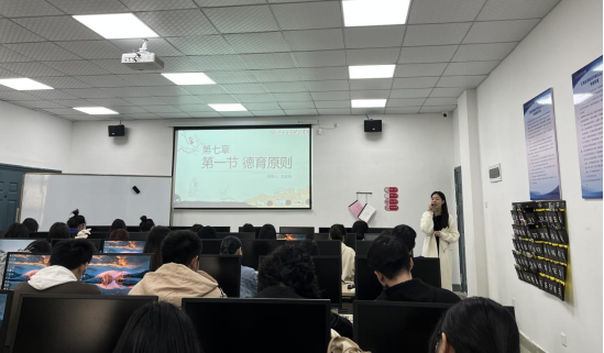 教学过程中,吴春燕老师首先通过将授课内容《德育原理》“第七章 德育原则”与教师资格证考试、教师招聘考试相联系,使学生认识到学好此次课的重要性,紧接着从认知、能力、情感态度三个维度,呈现本次课学习目标,使学生明确通过本次课要学什么。新课导入时,引导学生分析一个典型的教学案例,将德育理念、方法、原则贯穿在案例中,启发学生结合自身,积极思考分析案例。新课讲授时,通过提问:“什么是原则?”,激发学生立足自身,从生活中出发,发表自己对原则的见解,循序渐进引出教学重点:德育概念、原则。又很好地将德育理念融入古今中外伟大思想家、教育家的教育故事、名言古训中,潜移默化渗透了课程思政思想,进一步坚定了学生的文化自信心,增强了学生的文化自豪感。在讲授德育原则之一导向性原则时,一改传统的枯燥乏味地讲解方式,而是与社会主义共同理想--伟大的中国梦有机结合,引起学生的共鸣,加深了学生的理解。在讲授德育原则之一疏导性原则时,穿插影视剧中家庭教养方式视频片段的观看,启发学生围绕问题提出办法,让学生在理论与实践结合中更好地掌握理论知识,促进学生分析、解决问题能力得到提高。