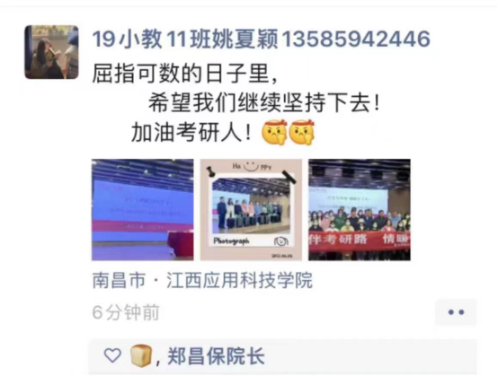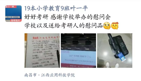 感谢校领导和学院老师对我们的关怀,在这紧张的考研备战期间,能够收到学校的考研礼包,给了我莫大的温暖和鼓励,我一定尽己所能,发挥最大的水平,努力向前冲!