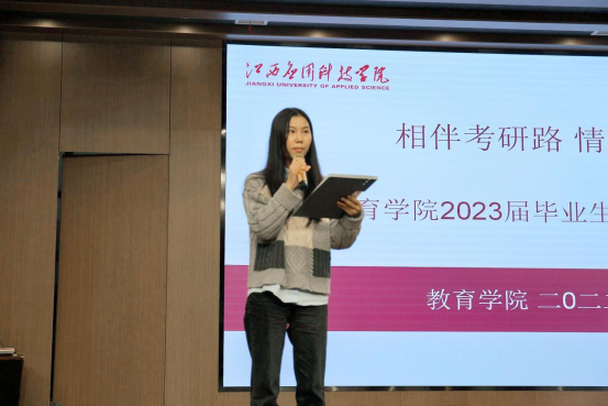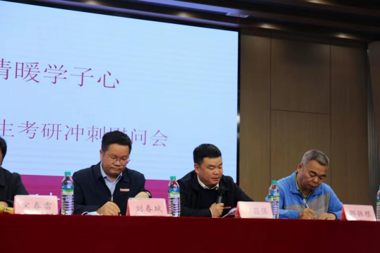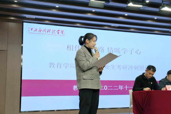 接着,毕业班辅导员代表涂文露老师结合自身考研经验与当下考研大纲,分享了考研方法供同学们参考。她指出,首先,希望同学们在备考中保持良好的心态,积极乐观复习备考做好充足的心理准备。其次针对不同的考试科目,同学们要分别讲究理解和复习方法,做到有效复习的核心。最后,希望同学们在备考的同时要注意保暖,保重身体,劳逸结合,坚持科学的作息习惯,保证充足的睡眠。星光不问赶路人,时光不负有心人,刻苦付出终有回报。愿在座的考研学子,都能一战成硕!