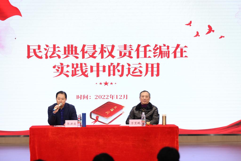 在讲课中,万里鹏和陈洪波两位教授围绕“民法典侵权责任编在实践中的运用”专题与同学开展了交流与讨论。两位老师穿插交通事故、高空抛物等日常生活中常见的法律案例,通过以案释法的方式帮助学生们理解法律的适用范围。期间,同学们踊跃参与,积极提问,形成了热烈的互动。