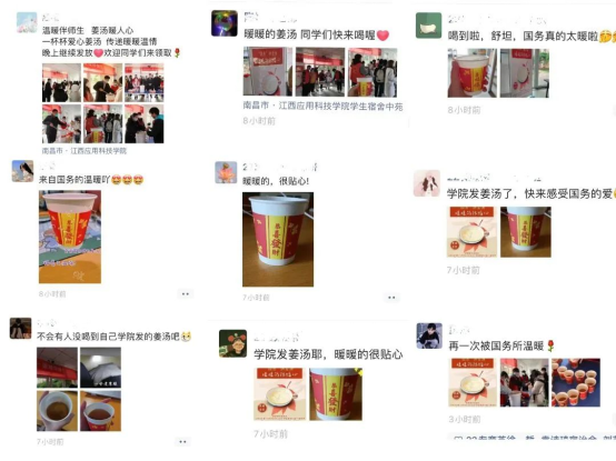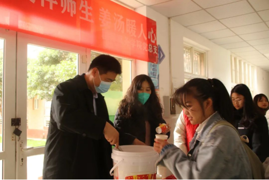 校党委副书记、纪委书记江星,我院院长王慧,党总支书记徐青,学工科科长唐燕琴以及全体专兼职辅导员来到学生宿舍5栋、6栋、20栋为我院学子发放精心准备的姜汤。一杯杯暖心姜汤不但驱走了冬日的严寒,更让全院师生感受到国务大家庭的温暖。