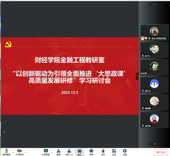 为深化课程思政改革,推进思政课改革与课程思政建设深入融合,12月6日晚,财经学院金融工程教研室召开“以创新驱动为引领全面推进‘大思政课’高质量发展研修”学习研讨会,金融工程教研室主任杨劲及教研室全体专职教师参与会议。