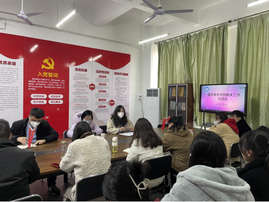 2023年1月5日上午10点,国际商务学院在三达楼207党员活动室召开期末工作协调会。校党委委员、副校长胥懋云、国际商务学院院长王慧、党总支书记徐青出席会议,国际商务学院全体行政班子成员、教研室主任、全体辅导员参加此次会议,会议由徐青主持。
