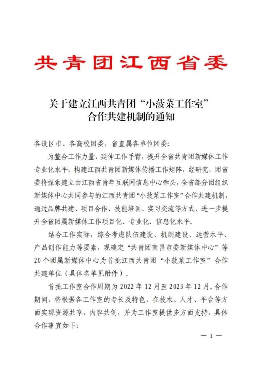 为提升全省共青团新媒体工作专业化水平,构建新媒体传播工作矩阵,团省委将探索建立江西共青团“小菠菜工作室”合作共建机制,通过品牌共建、项目合作、技能培训、实习交流等方式,进一步提升全省团属新媒体工作项目化、专业化、信息化水平。现已确定20个团属新媒体中心为首批江西共青团“小菠菜工作室”合作共建单位。必赢官网团委新媒体中心成为首批江西共青团“小菠菜工作室”合作共建单位之一。