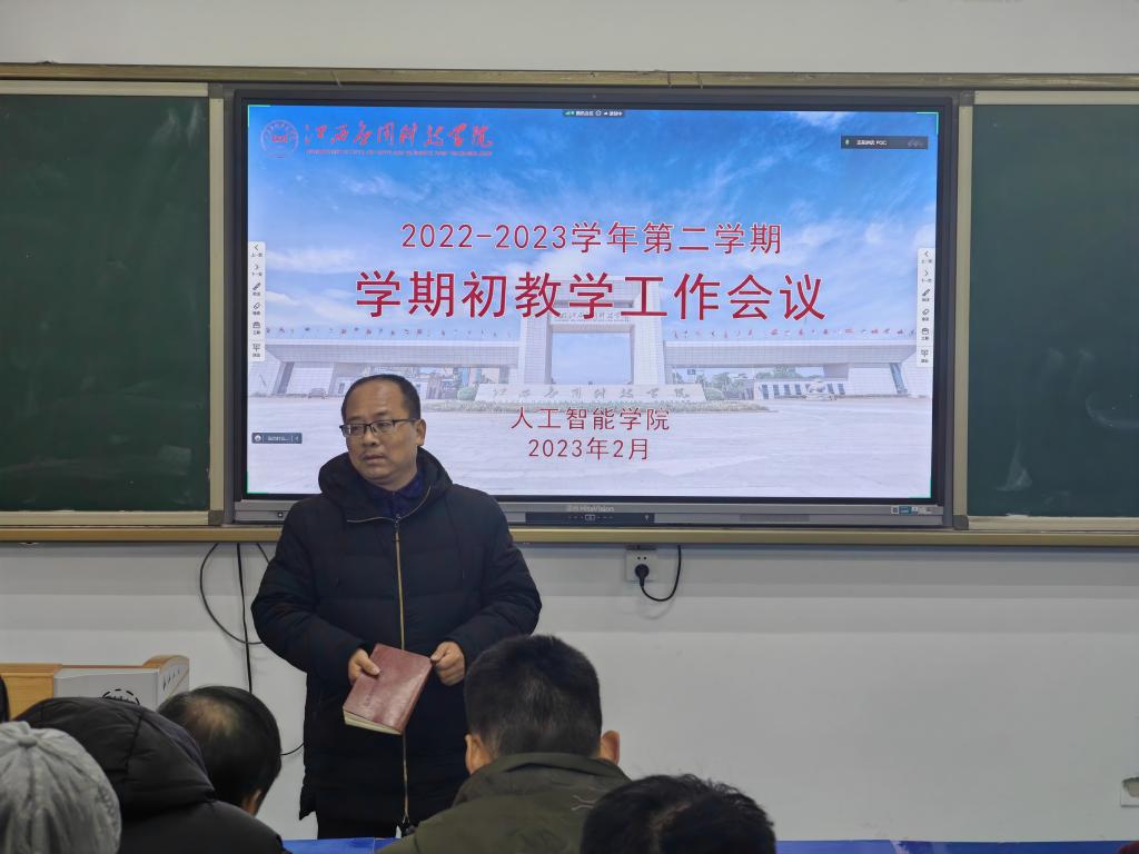 新春伊始,万象更新。为进一步规范教学工作秩序,做好2022-2023学年第二学期开学前后的教学工作,进一步深化落实精细化管理,突出教学工作中的引领、指导和监督作用,人工智能学院于2023年2月3日下午在三达楼阶梯九教室召开2022-2023学年第二学期学期初教学工作会议,人工智能学院院长李俊、副院长刘晔、副院长邓春华、全体专职老师、教务科全体成员参加此次会议,部分外聘专任教师通过腾讯会议线上参会,会议由教务科科长张召志主持。