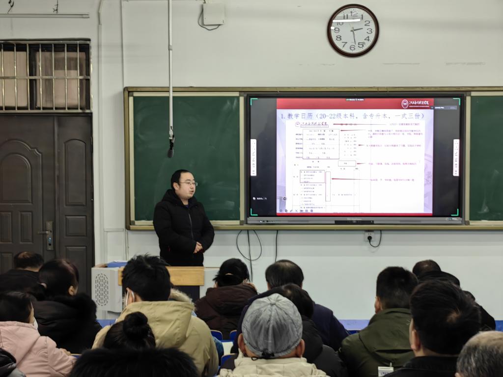 教务科科长张召志传达学校2022-2023学年第二学期开学前后教学工作的相关通知安排,教学实践科科长马启科强调2023届毕业生毕业实习相关工作,教务科舒连英分享期末考试、教学档案收集等相关工作安排。