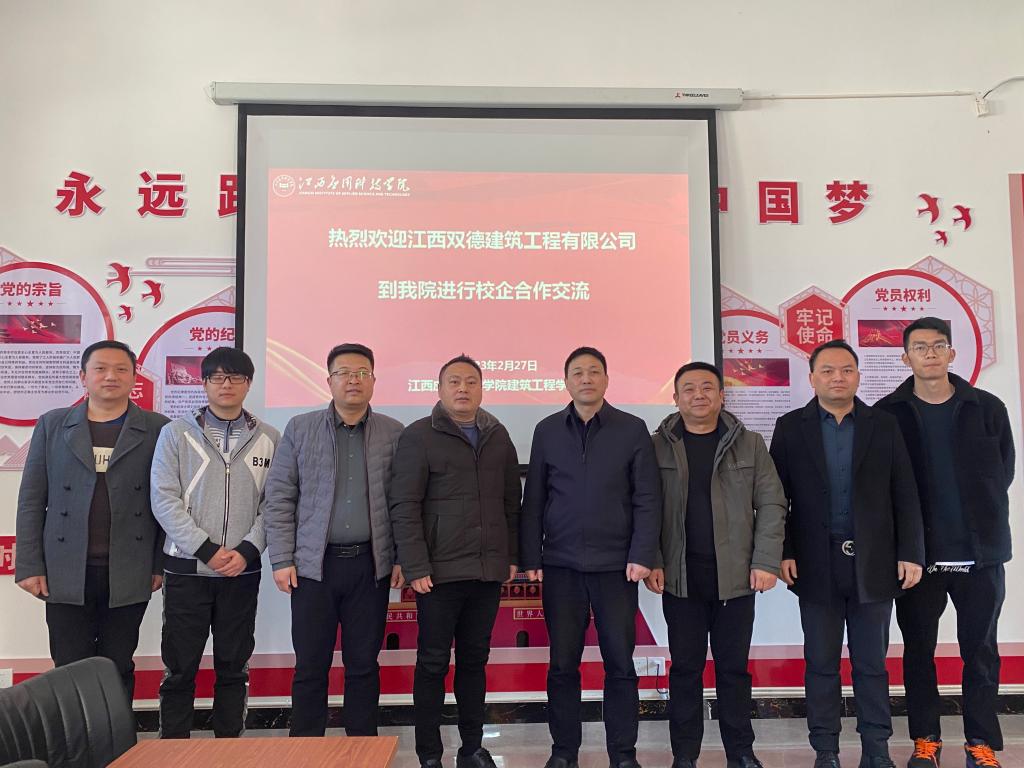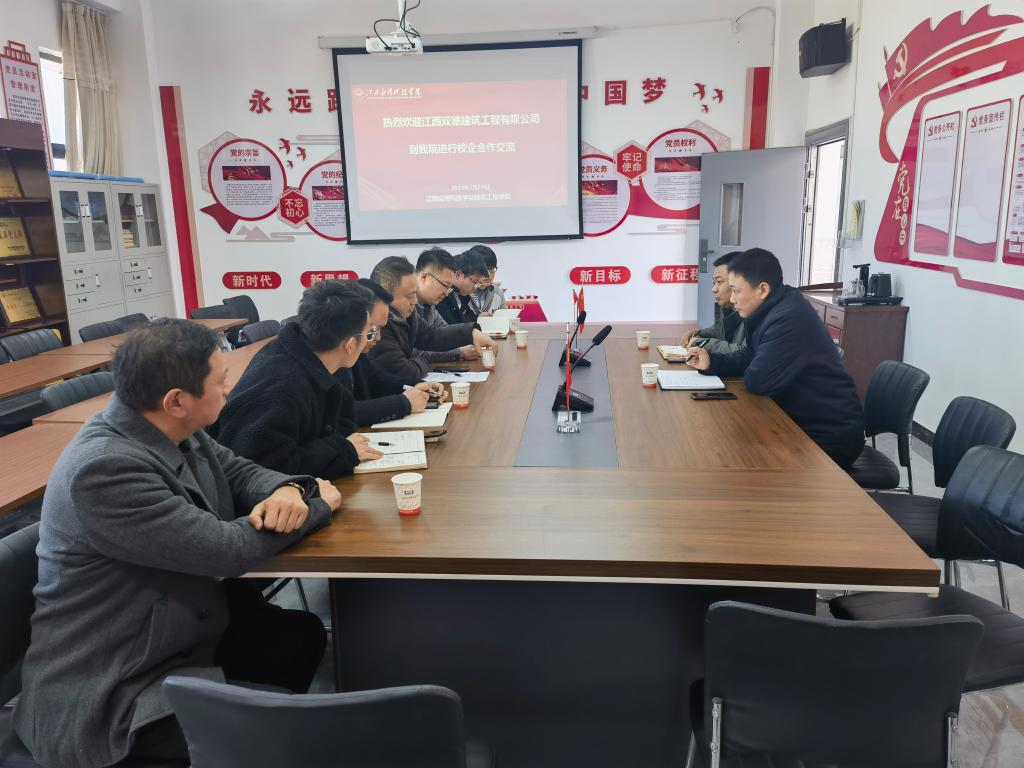 2023年2月27日上午,江西双德建筑工程有限公司副总经理、党委副书记丁云虎、研发部部长左文龙一行来院考察。建筑工程学院院长杨志刚、党总支书记刘伯川、副院长余春泉及各教研室主任在劲松楼402会议室展开深入交流。
