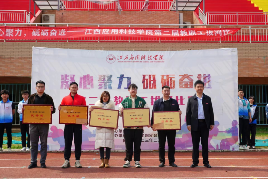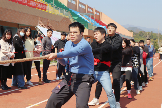 赛场上,老师们各个紧握绳索,卯着劲儿,身体锋奋力往后倾;两旁师生拉拉队的加油声、欢呼声此起彼伏,整个赛场一片欢腾。