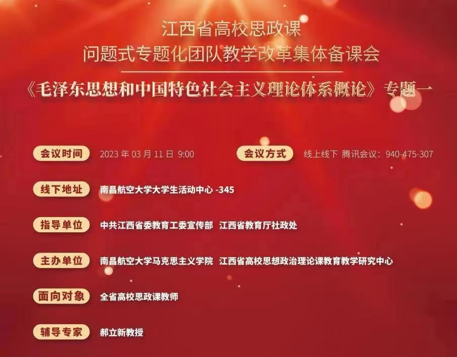 为纵深推进江西省高校思政课问题式专题化团队教学改革,2023年3月11日上午,我院《毛泽东思想和中国特色社会主义理论体系概论》课程教师积极参与了由南昌航空大学马克思主义学院、江西省高校思想政治理论课教育教学研究中心主办的线上集体备课会。