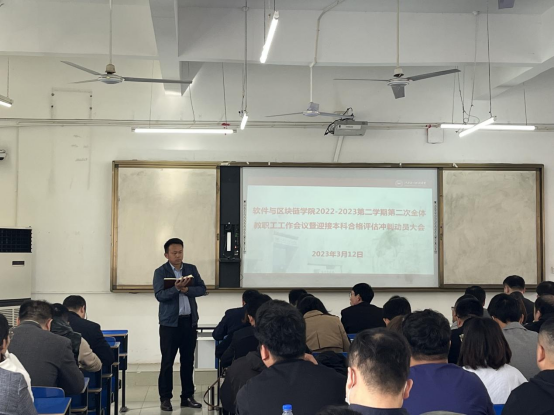 3月12日上午9:30,软件与区块链学院在三达楼222教室召开学院2022-2023学年第二学期第二次全体教职工工作会议暨迎接本科合格评估冲刺动员大会,学校顾问周忠伟教授、学院全体教职员工(含外聘教师、企业教师)参加此次会议,会议由学院院长卞秀运主持。