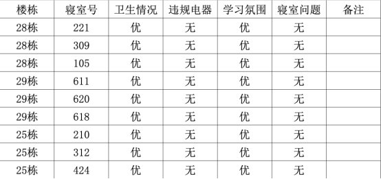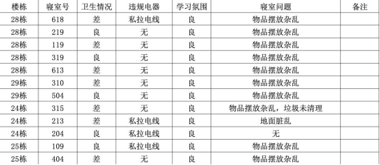 获得优秀等级的寝室继续保持宿舍良好情况,打造安全卫生的寝室环境,共创文明寝室!同时学院也已对较差寝室提出具体判定要求并提出整改。