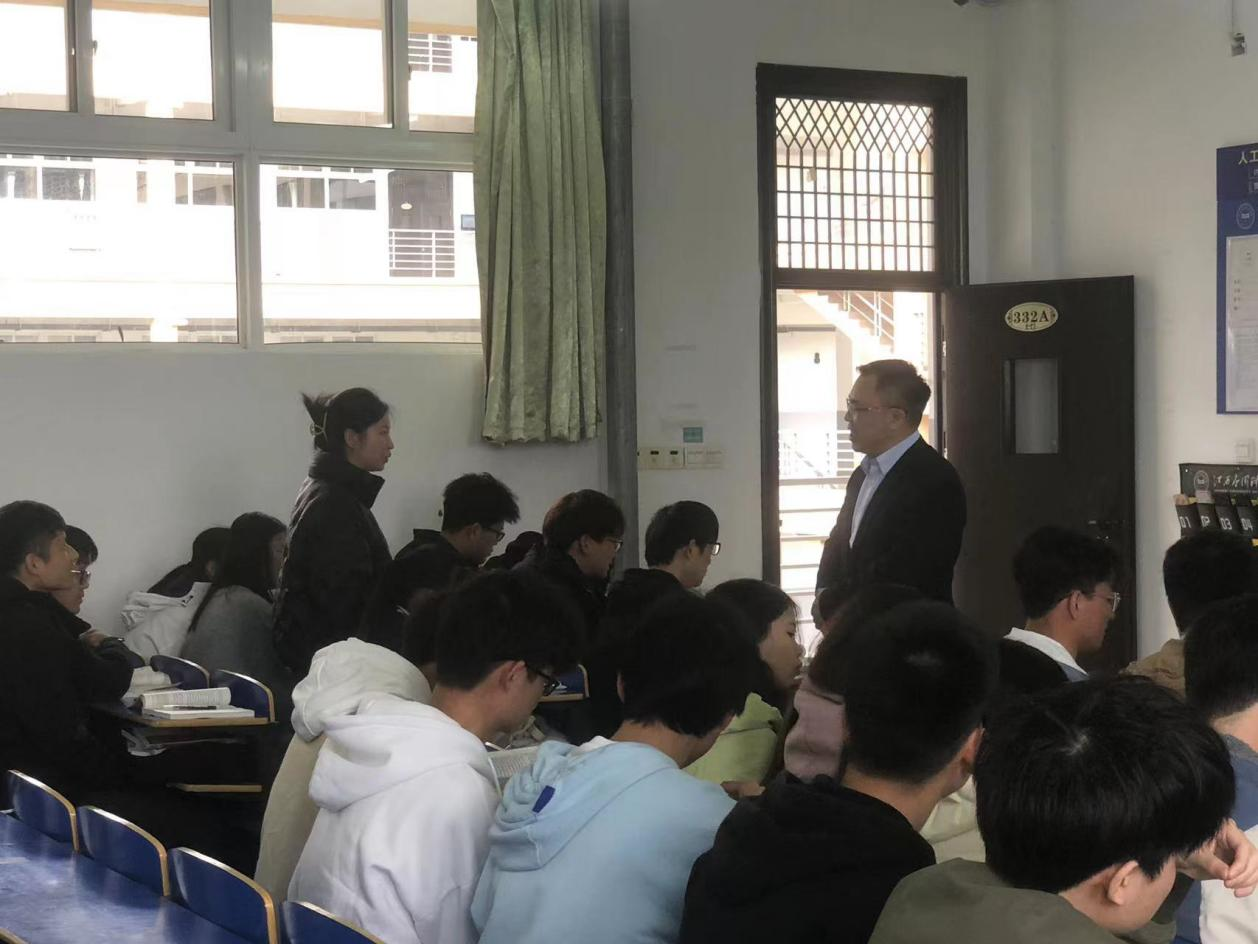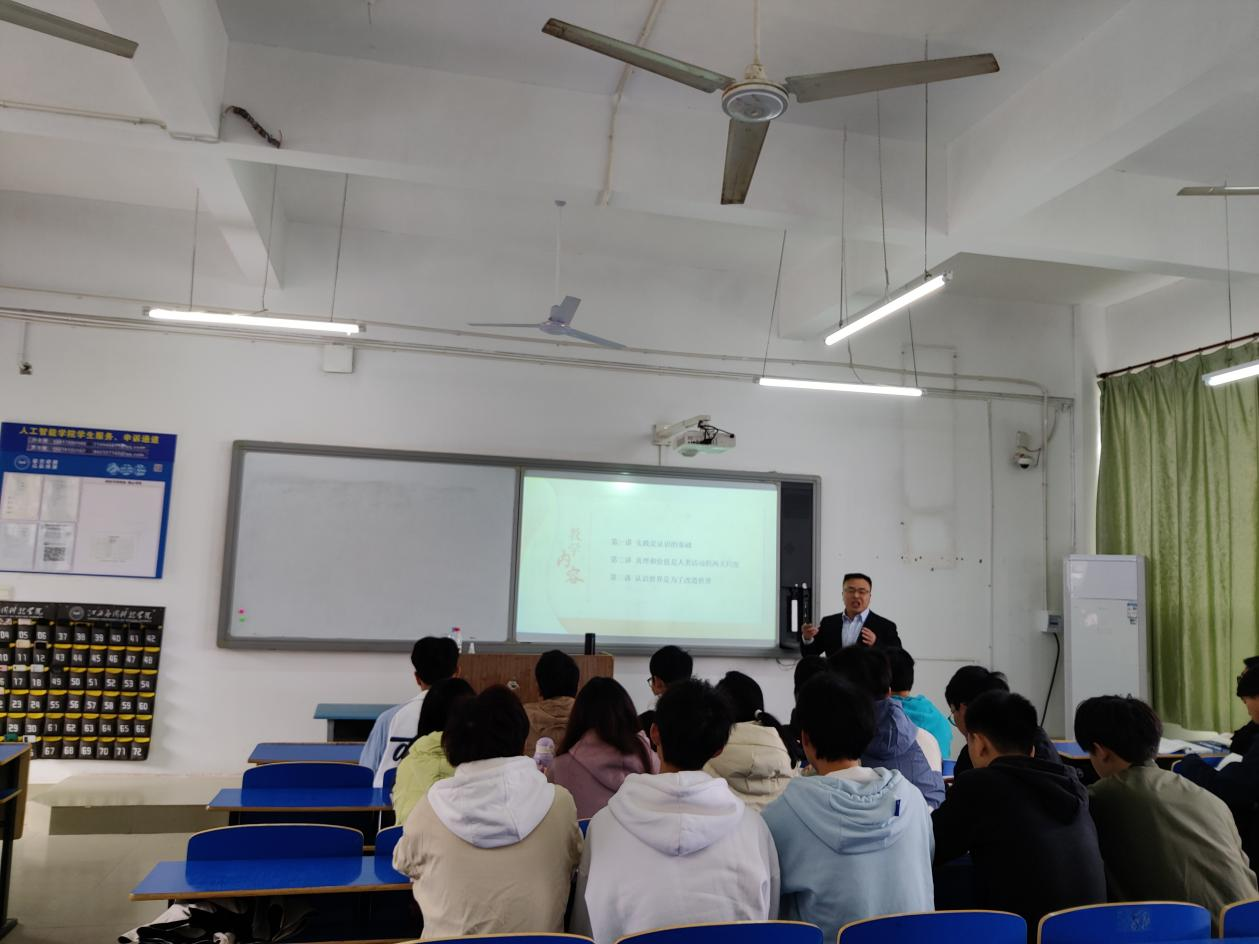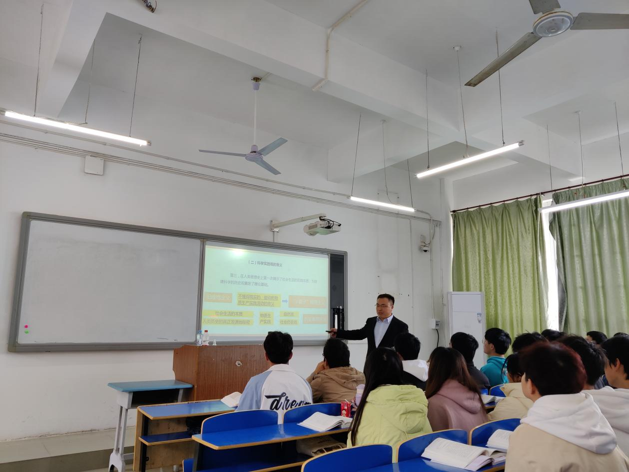 为全面贯彻党的教育方针,落实立德树人根本任务,聚焦发挥好思政课关键课程作用,在我省“大思政课”综合改革试验区建设的契机下,马克思主义学院积极创新教学方法,丰富教学内容,为使思政课更加有“知”有“味”有吸引力,我院联合南昌航空大学、江西师范大学、江西科技师范大学等兄弟院校,组织开展以《马克思主义基本原理》课程为主课堂的“一课多师”接力教学。3月23号上午南昌航空大学马克思主义学院罗绪春博士受邀来我院参与21级本科电子信息工程2班《马克思主义基本原理》课程的“一课多师”接力教学,马克思主义学院院长于冰雁、马克思主义基本原理教研室主任汪泽民以及马克思主义基本原理教研室任课教师一同观摩学习。