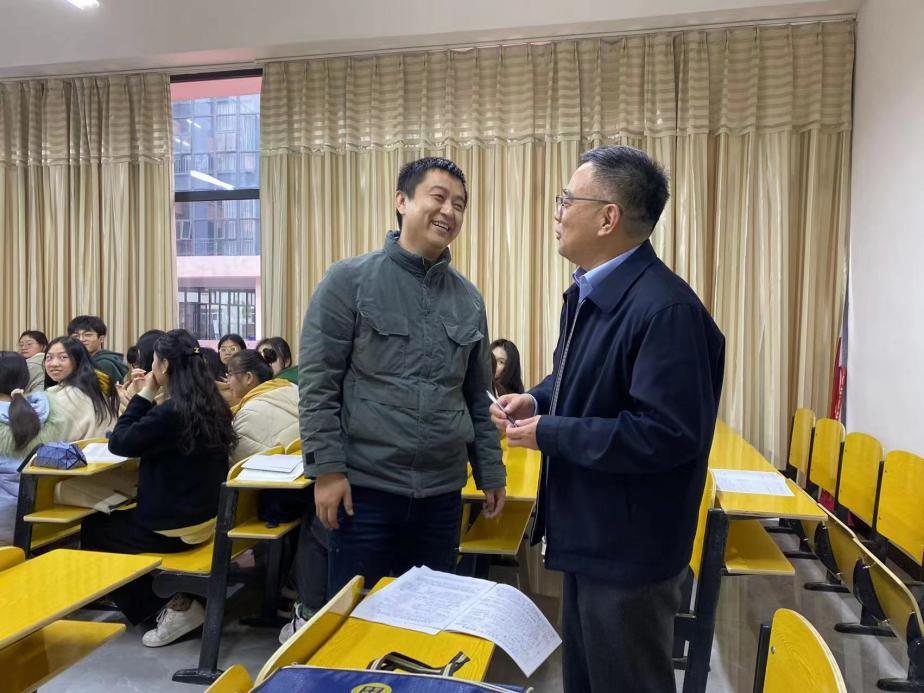 校长江作军来到三达楼分别听取了学院教师刘晓伟和刘帅帅的授课。课后江校长与授课教师就授课教学主题和教学设计进行了深入交流,对两位老师的备课扎实、讲解清晰表示了充分肯定,认为两人理论功底详实,在授课中能做到引经据典、旁征博引、中西贯通。同时,江校长希望两位老师能进一步引导学生发挥学习主动性,增强教学的针对性,使思想政治理论课真正成为学生喜闻乐见、终身受益的课程。刘晓伟和刘帅帅老师认真听取建议,并表示将继续向优秀教师学习,在教学技巧方面提升自己的教学能力。